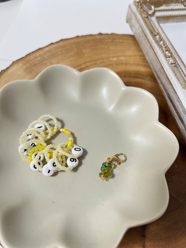 編み物時間に彩りを添える段数カウンターです。 ひっかかりを抑えるため、丸カンなどのパーツを使用せずに作りました。 また軽さも大事にしたかったので、テグスで編んでいます。 10の位に使っていただくマーカーのお花はリバーシブルで、どちらでもお花が見えます。また、真ん中の花芯が潰れない様に工夫しました。 8mmの棒針まで使用可能です。 9mmも入りますがぴったりのため使いにくいかと思います。 ・お使いの端末や環境により色味が異なって見える場合があります。 ・ビーズにも個体差があり、多少のゆがみがみられることがあります。 ・一つ一つ手作業で作成しています。商品の形にばらつきがあります。